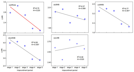 LWR changes in MCBs with different sizes: (a) whole, (b) SMBs, (c) MMBs, (d) LMMBs and (e) LMBs.