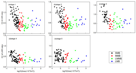 Relationship between CV of LWR and area of MCBs with different sizes in different impoundment periods: (a) stage 1, (b) stage 2, (c) stage 3, (d) stage 4 and (e) stage 5.