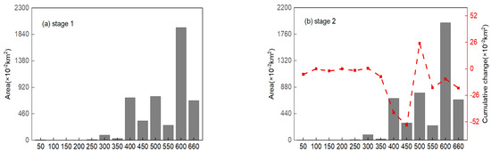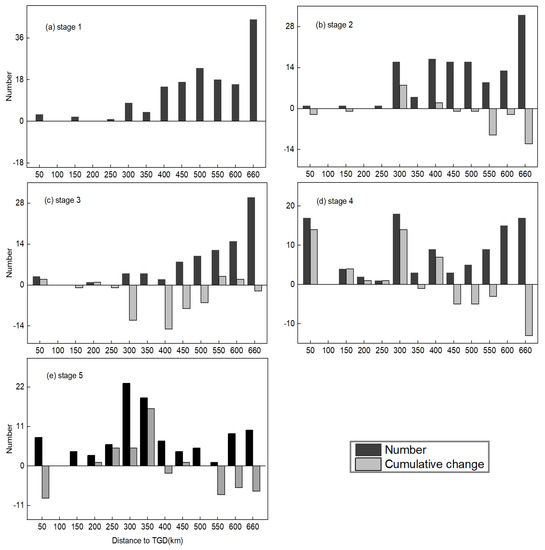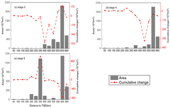 The spatial distributions of the number and area of MCBs in the TGR are shown in Figure 7 and Figure 8, respectively. It can be seen that the MCBs were unevenly distributed spatially. They were mostly distributed in the upper section of the TGR at 300 km from the TGD, accounting for 96.7% and 99.4% of the total number (Figure 7a) and area (Figure 8a) at stage 1. The distributions of the MCBs at the second stage (Figure 7b and Figure 8b) were generally similar to those at stage 1. The number and area of MCBs in the upper section of the TGR were reduced mainly due to the influence of human activities such as sand mining, which contributed mostly to the number decrease in MCBs from stage 1 to stage 2. A total of 41 MCBs with a total area of 1068.03 (×10−2 km2) disappeared in the section of TGR from 250 to 500 km from the TGD (Figure 7c), due to the inundation occurring when the water level rose to 139 m at stage 3. The number of MCBs changed dramatically in the whole reservoir as the water level increased from 139 m to 156 m at stage 4 (Figure 7d). In the section from the dam to 400 km from the dam, 40 new MCBs formed following the inundation of low-lying mountain tops by the reservoir, while the area changed slightly (Figure 8d), and meanwhile 26 MCBs disappeared in the section from 400 to 660 km from the dam due to the inundation when the water level rose, leading to a drastic decline in the area. After the official operation of the TGR in 2009, 26 new MCBs formed in the section from 200 to 350 km from the TGD (Figure 7e), resulting in the number proportion increasing from 6.3% at stage 3 to 48.5% at stage 5, and the area proportion increasing to 44.1% (Figure 8e). However, 21 MCBs with a total area up to 1287.11 (×10−2 km2) disappeared in the section from 500 to 660 km from the TGD due to the inundation when the water level rose to 175 m. The spatial variation of MCBs during the different stages was caused mainly by the rising water level and the expansion of the inundation area created by the water impoundments of the TGR. The results suggest that water impoundments at the TGR had led to the migration of the dominant area from the upper to the middle section of the TGR, resulting in a more even distribution of MCBs in the TGR.