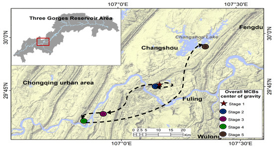 The weighted gravity center by area of the MCBs was compared during different impoundment periods, and the migration routes are presented in Figure 9. Generally, the spatial location of the gravity center of the MCBs varied obviously with the water level changes during different water impoundment periods. The gravity center migrated 2.04 km south-westwards after the interception of the Yangtze River at stage 2. It continued to move south-westwards with the rising of the water level, with migration distances of 25.68 km and 9.39 km when the water level reached 139 m at stage 3 and 156 m at stage 4, respectively. The migration direction of MCBs was consistent with the tail direction of the TGR, which was significantly associated with the expansion of the inundation area towards the tail direction of the TGR induced by the rising water level. However, many new MCBs formed in the middle section of the TGR, owing to the inundation of low-lying mountain tops by the reservoir, induced by the water level rising to 175 m at stage 5. This resulted in a notable migration of the gravity center to the middle section of the TGR. As can been seen from Figure 8, the gravity center moved 70.63 km north-eastwards from stage 4 to stage 5, which was opposite to the migrations from stage 1 to stage 4.