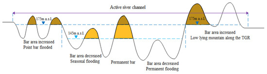 The mid-channel bar (MCB) is formed by favorable hydrological conditions in the river. It is a stable island above the river’s water level, formed by the gradual development and shaping of the river siltation over a long period [1,2]. The development of MCB is influenced by exogenous materials such as sediment, the transport capacity of flowing water and the sediment concentration, as well as by dam construction and reservoir regulations [3,4,5,6]. The dynamics of MCBs were significantly impacted by the water-level changes due to the impoundment of the TGR. [7,8]. On the one hand, some original MCBs in the Yangtze River were submerged, while some new MCBs were formed from the inundation of low-lying lands and point bars by the reservoir, due to the rising of the water level [9,10]. On the other hand, some MCBs were periodically exposed and submerged due to the annually cyclic hydrological regime induced by the TGR operation. Therefore, the morphology of the MCBs in the TGR changed significantly under the influence of these hydrological regime changes, which are expected to have an important impact on channel stability, water–land interactions and biological diversity [11,12,13].
