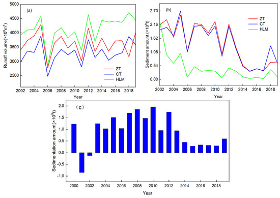 Water discharge and sediment amounts at the three key gauging stations in the different impoundment periods. (a) Annual runoff volume from 2002 to 2019, (b) annual sediment amount from 2002 to 2019 and (c) annual sedimentation amount from 2000 to 2019.