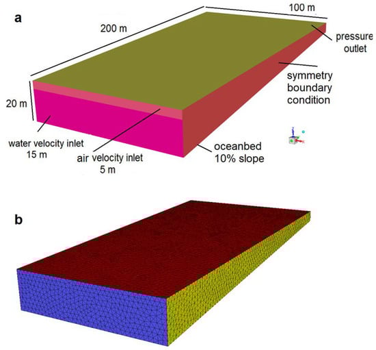 In this study, in order to consider the effect of wave propagation in the coastal marine environment, in addition to the VOF main model, the sub-models of the open channel flow and its wave boundary conditions (BC) were also included in the model setup. The air and oceanwater with densities of 1.225 and 1030 kg × m−3 were the primary and secondary Eulerian phases, respectively. The shear stress transport (SST) k-omega turbulence model was applied for the turbulence closure. It is the preferred model for VOF applications, as it supports turbulence damping in interfacial cells, which is critical for capturing interfacial instabilities.