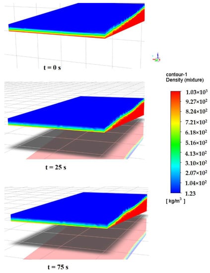 The density contours of the mixture phase for the case of an oceanwater velocity of 0.3 m/s at different simulation times are shown in Figure 3.