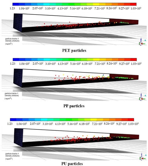 Suitable DPM boundary conditions of the “reflect” type were also applied to all surfaces, which keeps all particles available in the domain for the whole flow time simulation []. In these simulations, the interaction between the continuous phase and DPM particles was ignored due to the very low concentrations of particles in comparison with the volume of water. In other words, these simulations were one-way coupled. There were also no DEM collisions between the plastic particles, but the effects of the virtual mass, pressure gradient, and Saffman lift forces on the particle trajectories were included []. Three types of microplastic particles with different densities, sizes, and shapes were defined as given in Table 1.