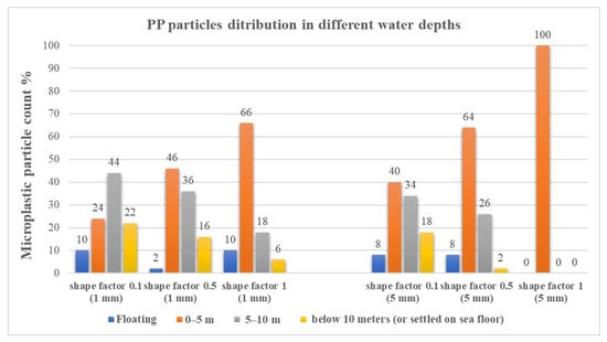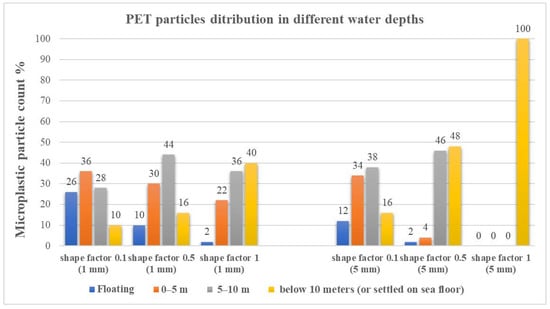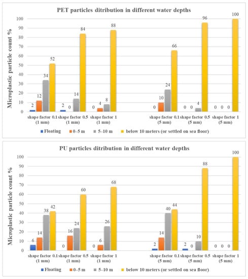 In the case of spherical PET, 100% of the large 5-mm particles have sunk to below 10 m or at the bottom of the sea due to their higher mass compared to the small particles, of which only about 40% are at those depths due to higher water flow velocities providing smaller particles less opportunity to settle down to deeper levels. Non-spherical large 5-mm particles with shape factors 0.5 and 0.1 show that approximately 50 and 15% sank below 10 m as compared to the spherical counterpart. For non-spherical small 1-mm PET particles, the influence of the shape factor was more pronounced in that only about 15% sunk below 10 m. Similar trends were observable for the PU microplastics in Figure 8. At a 0.3 m/s water velocity, the PP particles demonstrated that the shape factor does not play an important part in the float–travel–sink interplay, and interestingly, almost independent of the shape and size, around 30–40% of the floating on the water surface and most of the rest are situated between the surface and a 5-m depth.