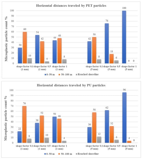 Figure 9 presents the horizontal distribution charts for all microplastic particles, where the water velocity is 0.1 m/s. It can be seen that most of the PET and PU particles were scattered into two distance ranges of 0–50 and 50–100 m, and those particles traveled for longer distances up to 200 m (reporting on the shoreline), limited to a maximum of 12%. However, 100% of 5-mm spherical and 76% non-spherical with a 0.5 shape factor mainly traveled a maximum distance of 50 m, while about 60% of the 5-mm non-spherical particles with a 0.1 shape factor traveled further, between the 50 and 200-m range. For small 1-mm particles, approximately 90% traveled up to 100 m, which is distributed evenly for different shape factors. The rest traveled about 10% further to 200 m, which was the shoreline. The fraction of PU particles for longer distances travel in all classes was also comparatively more than that of the PET particles, probably owing to its lower density.
