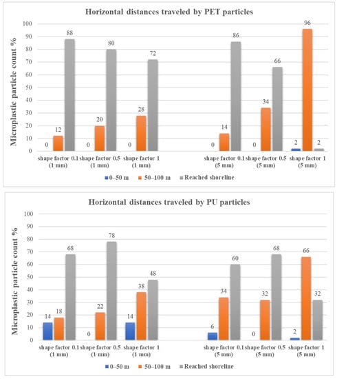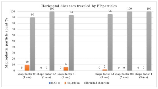 In the case of PP particles, it is obvious that longest travels were achieved by the ones with spherical shapes; 84% of the small and 100% of the large particles traveled between 50 m and the shoreline. Moreover, 40% of the 5-mm spherical-shaped particles reached the shoreline, and 60% traveled between 50 and 100 m in range. For non-spherical small particles. the results revealed that a maximum of 22% reached the shoreline as compared to only 14% of the large 5-mm ones. This shows that there is an interplay between shape and size for non-spherical PP particles in terms of distribution, while, at the same time, spherical particles showed that the larger ones traveled farthest with a 0.1 m/s water velocity, which was a completely different scenario in the case of 0.3 m/s, as can be seen in Figure 10.