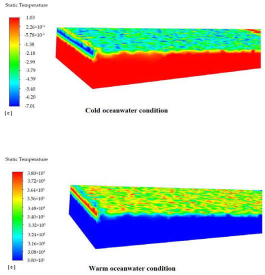 The static temperature contours for the mixture phase after 20 s in both cold (1 °C) and warm (30 °C) conditions of oceanwater with a speed of 0.1 m/s are shown in Figure 11. This figure shows the static temperature variations inside the computational domain, and the differences between the oceanwater and surrounding air temperature in both climate conditions are clear. The air temperature at the air inlet was set equally 8 °C colder and warmer than the oceanwater phase. It is seen that the main variations in temperature occur at the water surface and the air zone above it. The water temperature below the ocean surface remains constant for both temperature conditions.