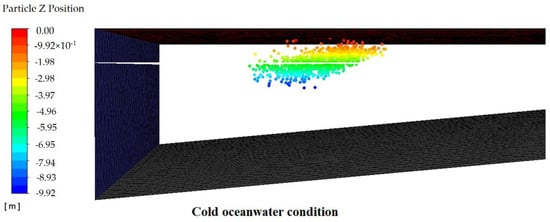 According to the available data about the temperature of oceanwaters globally, two different temperatures of 30 and 1 °C were selected for the oceanwater zone to represent two opposite conditions of warm and cold weather. The temperatures of the air at the inlet and outlet above the oceanwater were also adjusted based on the weather conditions. For cold and warm weather conditions, the temperatures of the air were assumed to be −7 and 38 °C, respectively. The initial temperature for all the particle injections was also set to 5 °C. In order to save more computational time, two comparative simulations were carried out for a flow time of 20 s.