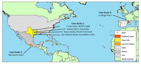 Location of the three case studies and the analysed basins: four in USA (Case Study 1), one in Mexico (Case Study 2), and one in Spain (Case Study 3).