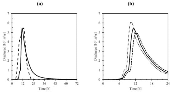 Results of Case Study 2: (a) hydrograph resulting from the aggregated approach (dashed line), and from the distributed approach, the best fit of the roughness coefficient resulted (continuous line); (b) first 24 h of the hydrograph from the distributed approach and hydrographs considering ± 20% of the roughness coefficients (dot and dashed lines).