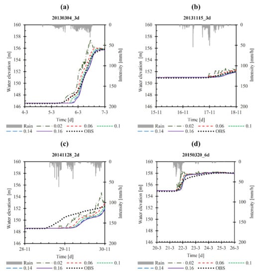 In Figure 4a, the results of 20130304_3d event are shown, which concentrates on the rainfall during day 2 and the first-half of day 3. In it, the simulated water elevation at the end of the event is similar to the observed one for all scenarios, with relative errors being less than 1.5%, and the value of being 0.1 s/m1/3—one that achieves the best adjustment (0.005% of error). For this event, significant differences on the arrival time of the flood can be observed, with a time gap of around 12 h between the hydrographs corresponding to the minimum and maximum values. The evolution of the water elevation during the second-half of day 2 clearly shows faster hydrological responses for low values of .