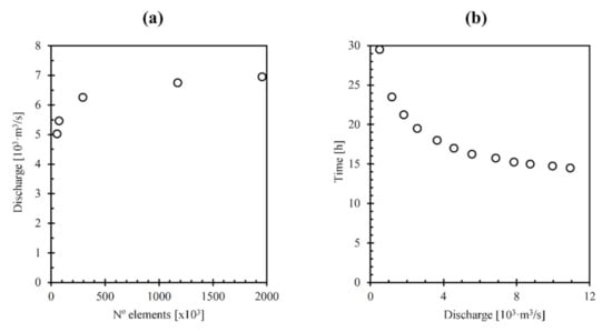 To illustrate the last two facts, a double sensitivity analysis was carried out on Marquelia basin. The results show that the peak discharge increases when the number of elements of the numerical model also increases (Figure 5a). An asymptotic trend towards 7000 m3/s is observed for calculation meshes with more than 1.9 million elements. This peak discharge increment is probably due to the better representation of the topography, in general, as well as the better definition of the river-channel, in particular, which improve the flow propagation representation. This last domain discretisation (1.9 M elements) represents approximately 19 elements per ha, which is still far from the values of flood studies where more than 1000 elements per ha is quite common [].