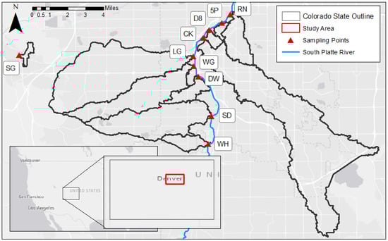The South Platte River flows through Denver, Colorado and represents a source of recreation for people, habitat for aquatic life, and a supply of drinking water for Denver and downstream communities [23]. Similar to many urban waterways, urban processes and drainage within the city severely impair the river’s water quality [24]. This metropolitan area is situated in a semi-arid climate and, similar to many urban waterways in the western United States, the South Platte River is dominated by wastewater effluent during periods of dry-weather [24]. However, wastewater treatment plants and other point sources have largely been characterized and are regulated under varying legislature such as the Clean Water Act (CWA) and surface water quality standards set by the Colorado Department of Public Health and Environment (CDPHE) [24,25,26]. Though these point sources of pollution certainly contribute to stream impairment, nonpoint sources have been identified as significant and uncontrollable sources of contamination and have the potential to produce pollutant loads at magnitudes equal to or greater than point sources [4,24,27,28,29]. Nonpoint sources can pollute wet-weather and dry-weather flows. While a couple studies have characterized Denver’s wet-weather (stormwater) runoff quality (e.g., References [30,31]), a detailed investigation of dry-weather flows for Denver has not been published, evidencing a need for this study.