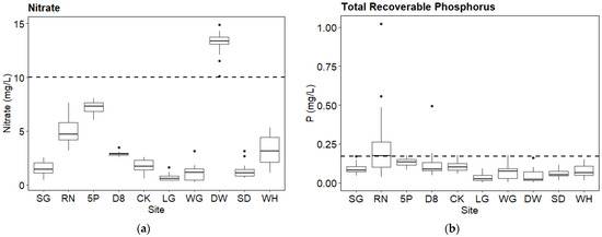 Nutrients that exceeded CDPHE standards were nitrate and total P: (a) Boxplot results with the acute CDPHE standard for nitrate. (b) Boxplot results with the CDPHE standard for total P.