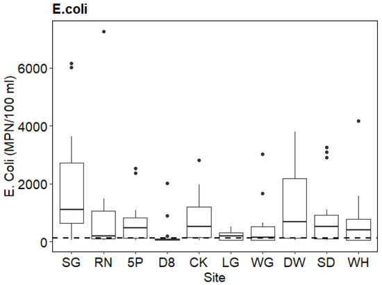 - Wu, J.; Rees, P.; Dorner, S. Variability of E. Coli Density and sources in an urban watershed. J. Water Health 2011, 9, 94–106. [Google Scholar] [CrossRef] [PubMed] [Green Version]