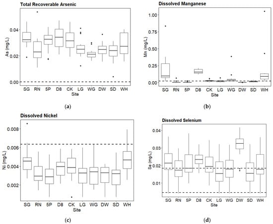 Metals that exceeded CDPHE standards were total As, dissolved Mn, dissolved Ni, and dissolved Se: (a) Boxplot results with the chronic CDPHE standard for total As. (b) Boxplot results with the chronic CDPHE standard for dissolved Mn. (c) Boxplot results with the chronic CDPHE standard for dissolved Ni. (d) Boxplot results with the acute and chronic CDPHE standards (acute standard was higher than chronic) for dissolved Se.