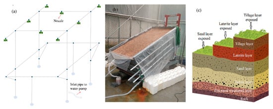 Schematic diagrams of experimental equipment with (a) rainfall simulator, (b) test plots, and (c) soil layers for classical weathered granite slopes.