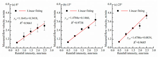 Relationships between measured runoff velocity and rainfall intensity on different slopes.