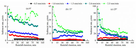 Sediment rate with rainfall duration under different experimental conditions.