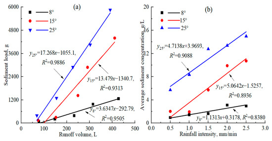 Relationships between (a) sediment load and runoff volume, (b) average sediment concentration and rainfall intensity under different experimental conditions.