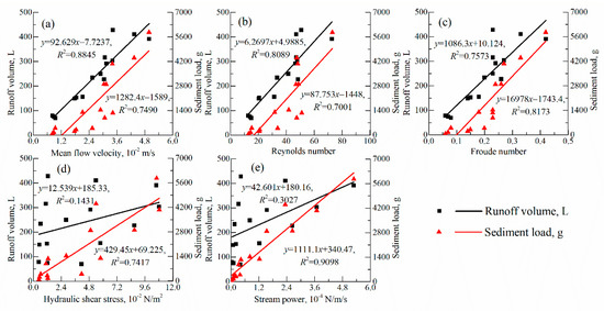 where SL is the sediment load, g; SS is the slope steepness, m/m; RI is the rainfall intensity, mm/min; V is the runoff velocity, 10−2 m/s; h is the runoff depth, mm; Re is the Reynolds number; Fr is the Frounde number; τ is the hydraulic shear stress, 10−2 N/m2; w is the stream power, N/m/s; n is the number of the samples. Equation (8) shows that the relationships can be described by a linear equation with a determination coefficient (R2) larger than 0.96.