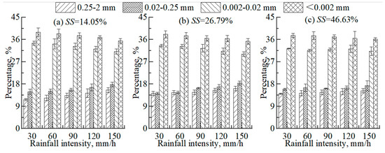 The trends of Sr changing with rainfall duration under different experimental conditions are depicted in Figure 4. Sr increased sharply at the initial stage and then displayed a rapid decreasing trend with the prolongation of rainfall duration with some minor fluctuations under most of the rainfall occurrences, which is mainly due to the first flushing effect [4]. There was strong splashing erosion in the runoff flumes during the initial pre-saturation stage of the experimental soil before the generation of surface runoff. Surface runoff gradually formed with the prolongation of rainfall duration and migrated to the bottom outlet, transporting the mobile particles that have been activated in the earlier stage. The soil erosion induced by rainfall commonly consists of the rill and interrill components according to the source of the eroded sediment [9,67]. The pattern of soil erosion in this study belongs to interrill erosion due to the relatively short slope length (2.0 m) of the experimental runoff flumes [2]; there was almost no rill erosion. Interrill erosion is more likely to transport fine sediment, because the coarse sediment is hard to activate and transport down the slopes. Surface runoff has been reported to be a key factor in controlling soil erosion on hillslopes due to its ability to detach and transport soil materials [68]. There are two erosion mechanisms: raindrop splashes and runoff washes [69]. Soil aggregates in the topsoil are destroyed by raindrop kinetic energy and then the fine-grained particles are peeled off and carried away [70]. The soil aggregates can be disrupted by quick wetting and mechanical breakdown due to raindrop hammering [71]. The strong disruption of soil materials and fast formation of crusts on the surface are related to the increasing RI. Sr has a positive correlation to RI, and the average Sc is positively interrelated to both RI and SS (Table 1). The accumulative SL also positively correlates with the increasing RI and SS, with a range of 74.50–5857.25 g. The increasing times of total SL on the slopes with SS of 8°, 15°, and 25° were, respectively, 15.93, 28.17, and 13.85 when RI increased from 0.5 to 2.5 mm/min (Table 1). Figure 5 shows that the sediment yield is positively linearly related to total the Rv on various slopes (R2 > 0.93). The average Sc also positively correlates with RI (R2 > 0.83) and the order of the average Sc under different slopes is 25° > 15° > 8° when RI is uniform, indicating that the increasing sediment rate is faster than that of runoff generation. These results are similar to the findings of Tuset et al. [72], who found that the fluctuations of suspended Sc are strongly correlated to runoff magnitude and the amounts of eroded sediment correlate to Rv. The average Sc increased about 2.10, 4.26, and 1.62 times, respectively, for the slopes with SS of 8°, 15°, and 25° when RI increased from 0.5 to 2.5 mm/min. The erosion form changed from a transporting limitation to a detaching limitation when RI increased, to some extent because of the soil’s inherent susceptibility to form seals [67].