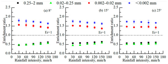 The PSD of eroded sediment is affected by many factors including soil properties, such as texture and clay content [23]; soil nature, e.g., soil aggregates, moisture, and particle size [17]; the rainfall nature, e.g., intensity and duration [60]; and runoff types, e.g., shallow flow and rill flow [27]. The soil texture has been reported to be one of the most predominant factors affecting the PSD of eroded sediment [24,74]. The temporal and spatial variability of eroded sediment PSD depends on the main factors impacting the erosion process. A better understanding of the process of sediment transportation and the characteristics of size selectivity can increase our understanding of the functions and interactions of these different factors. In this study, the percentages of PSD for eroded sediment present an order of clay (<0.002 mm) > silt (0.002–0.02 mm) > fine sand (0.02–0.25 mm) > coarse sand (0.25–2 mm) when RI and SS are determined, which is the opposite of the original soil order (Figure 7). The eroded sediment is principally composed of silt- and clay-grained particles that account for about 65.41–73.41% of the total SL. There is a boundary point at 0.02 mm for the PSD of eroded sediment because the percentages of sand-grained particles (0.02–2 mm) generally increased with the increasing RI, while that of clay- and silt-grained particles regularly decreased. However, there is no notable regularity of PSD among slopes with different SSs under the uniform RI. The Er of various sediment particles under different experimental conditions can prove the existence of a grading limitation of 0.02 mm for sediment transportation (Figure 8). The Er of sand-grained particles are all <1 with a range of 0.45–0.65, while that of clay- and silt-grained particles are >1 with a range of 1.37–1.80. The Er of clay and silt particles are negatively related to SS, whereas the Er of sand-grained particles present no notable regularity related to SS. The results of Er for silt- and clay-grained particles are similar to the findings of Lin et al. [75] with a range of 1.1–1.4, indicating a more severe depletion for silt- and clay-grained particles in the original soil. However, the Er of sand-grained particles is inconsistent with their corresponding results and the main interpretation might be due to the difference in experimental conditions and setup. Other studies have found that eroded sediment presents bimodal distributions in that particles with both large and small grains are easily transported, while the particles with intermediate-sized grains are not migrated [10,58]. In theory, fine-grained particles mostly gather in aggregates because of soil cohesion, while coarser particles are large enough to be moved without forming aggregates [6]. To some extent, the clay- and silt-grained particles are difficult to peel away and transport due to their agglomerate structure. Fine-grained particles become available for transportation and enrichment when the rainfall energy is high enough to break soil aggregates; however, coarse particles with high resistance are not easily displaced and transported during the erosion process [23]. The increasing RI and level of raindrop energy led to an increase in the proportions of sand-grained particles; this phenomenon is more pronounced on the steeper slopes. Large raindrops increased the detachment of soil particles and the transporting capacity of the surface runoff. This demonstrates that soil aggregates can be broken down into smaller masses and transported in a suspension, accounting for the notably higher proportion of fine-grained particles in the eroded sediment than the original soil. In contrast with the results of this study, some research has shown that the particles in the eroded sediment are mostly consistent with the original soil, or even coarser [58]. The process of sediment transportation is not only determined by the amount of raindrop energy, but also by the physico-chemical properties of the original soil [76]. The sand-grained particles may be relocated on the downward slopes during the transporting process even after they have been dragged and are unable to migrate significant distances. Raindrop splashes induced a particle cloud in the surface runoff, and the suspended particles might have been relocated on the slopes when the sedimentation velocity was faster than the flow velocity. The moving distance of the transported particles is determined by the runoff velocity, the sedimentation rate, and flowing height of the particles [53]. Overall, the transporting capacity of the rainfall runoff in this study is very strong due to the weak cohesive force between soil particles and the combination of heavy rainfalls and steep slopes in the weathered granite area, making the eroded sediment easy to transport.