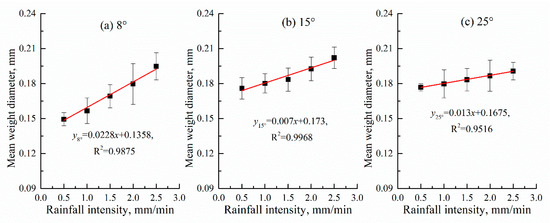 The MWD is calculated in order to reconsider PSD, reflecting the stability of the original soil [10]. The MWD of the eroded sediment shows positively linear relationships with RI (R2 > 0.95) with a range of 0.15–0.20 mm (Figure 9). The differences between the maximum and minimum values of MWD on slopes with SS of 8°, 15°, and 25° become smaller and are, respectively, 0.045, 0.026, and 0.014 mm. The MWD of the eroded sediment is far less than that of the original soil (0.31 mm), indicating that a greater number of fine-grained particles are enriched in the eroded sediment by interrrill erosion. The correlations between the Er of various sediment particles, MWD, and different hydraulic parameters were analyzed (Table 3). There are positive correlations among Er1 (0.25–2 mm), Er2 (0.02–0.25 mm), MWD, and different hydraulic parameters, while negative correlations are observed for Er3 (0.002–0.02 mm) and Er4 (<0.002 mm). The MWD correlations are extremely significant among RI, V, Re, Fr, and Er. For τ, the correlation is only significant for Er3. Regarding h and SS, the correlations are not significant. The MWD is also found to positively correlate with the different hydraulic parameters; the correlation between h and SS is the weakest. Some studies analyzed the Er3 and Er4 of eroded sediment by comparing to the undisturbed soil, concluding that that the eroded sediment becomes coarser and more stable as rainfall duration increases [10]. It is commonly speculated that clay- and silt-grained particles accumulate at the beginning of rainfall. The approximate threshold of transportation between suspension/saltation and bed loading can be identified by the size classification and minimum transporting rate [9,69]. Hao, Wang, Guo, and Hua [19] found that the aggregates <0.05 mm are preferentially moved by suspension/saltation while those between 0.105 and 0.25 mm are usually resistant to runoff transportation. Loch and Donnollan [77] also concluded the transitional size variation of 0.125–0.25 mm from suspension/saltation to bed loading. Leguedois et al. [78] reported that particles ≥0.05 mm are carried away in the form of individual airborne particles, while those <0.05 mm are moved in aggregates. The research performed by Asadi, Moussavi, Ghadiri, and Rose [58] indicated that the critical range of size classes for bed loading is 0.18–0.38 mm in the fluvial sand, while it is 0.5–1.0 mm in the forest soil. Studies by Harchegani, Sadeghi, and Asadi [1] and Wang and Shi [79] reached findings that were similar to the critical point of 0.063 mm for the depletion/enrichment of sediment particles by interrill erosion. The differences between these results may be attributed to varying soil textures, causing different erodibility and rainfall characteristics with different hydraulic parameters [74]. Another interpretation is that the grading criteria and operating methods are different. Altogether, the actual grading limitation of the transporting mechanisms between suspension/saltation and bed loading depends on both the soil properties and hydraulic characteristics. Further tests that investigate sediment size characteristics with more detailed classifications should be conducted to specifically discover the accurate grading limitation. Furthermore, effective conservation practices should be taken into consideration to mitigate soil and water losses from the bare hillslopes of weathered granite, since heavy rainfalls mostly have a high probability of occurrence in these areas, particularly those with intensive agricultural practices.