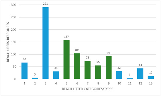 The results obtained from this work are classified into three main categories: (a) Litter categories/types identified by beach users, (b) Visitors’ perceptions of the degree of beach pollution and (c) Application of the qualitative and quantitative calculations of the BLAT-QQ. Figure 3 shows the beach users’ responses to question 4 (Q4, Table 1) that asked to identify the most common litter types.