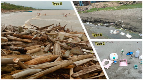It should be noted that Types 5 and 8 can be considered somehow controversial. The common definitions of litter do not consider vegetation debris as litter [40,42] but, from the managerial perspective, the aesthetic and safety (physical and microbiological) aspects of vegetation and organic debris have been considered an important issue on beaches used primarily for tourism [8,43,44,45,46,47,48]. In this study, unprocessed wood (essentially trunks, branches, etc.) is considered gross vegetation litter. As observed in numerous studies, river discharges constitute one of the primary sources of litter [49,50,51,52,53], and wooden debris has been reported to be one of the most numerous items found on beaches especially after heavy rains [54,55,56]. The management of large organic debris entering the sea through big rivers is a major problem on many tropical beaches around the world. Although there is not much scientific literature on this issue, the abundant quantity of vegetation debris seems to be consequence of both natural reasons, i.e., the favorable tropical climate temperatures and abundant precipitation favor the development of vegetation along the riverbanks, which are often flooded and therefore vegetation is carried away; and anthropogenic activities, i.e., large areas are often deforested for agricultural purposes or urban developments and vegetation debris is thrown into nearby streams and rivers ending up in the sea.