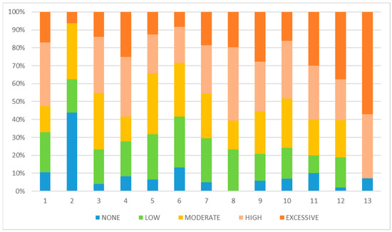 Figure 5 shows beach users’ responses to question 5 (Q5, Table 1) that indicates the perceived degree of impact of litter. This figure also shows a relationship between beach litter categories/types previously detailed and the perception of impact by users. Many types of litter included in BLAT-QQ (5, 6, 7 and 8) were perceived to cause “moderate” and “high” impacts. Similarly, Type 4 (potentially harmful litter: broken glass, glass bottles, blades, similar), Type 11 (oil), and Type 12 (feces) were identified to have a disproportionate level of impact, although the frequency of appearance of those types was relatively low (Figure 3). Despite the low frequency of Type 2 (general gross litter: car parts, appliances, similar), it was included in the classification because it was associated with a “moderate” level of impact and this litter type represents a significant problem for beach management [48]. Lastly, Type 13 (others) had the highest level of impact but, because of its indeterminacy, it was discarded.