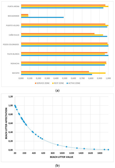 As the last stage of the research, the average results of the application of the BLAT-QQ instrument were compiled and illustrated (Figure 6 and Figure 7). Figure 6a shows the beach litter values per sampling strip for the eight beaches, calculated from Equation (1). In general terms, all beaches showed similar patterns in the three strips of beach, except for the urban beach Bocagrande, where the beach strips “service” and “rest zones” (terminology according to the Colombian legislation, Decree 1766 of 2013) had extremely low values. As noted above, the beach litter values were normalized using Equation (2) to obtain the beach litter cleanliness. Figure 6b shows the mathematical relationship in which lower beach litter values (20) correspond with minor levels of cleanliness (1.0) and vice versa. In short, this calculation transforms a linear parameter (beach litter) to a cumulative value represented by an exponential pattern, providing a better measure of the impact of beach litter on environmental quality [41].