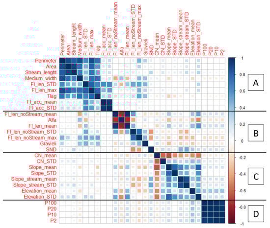Visualization of the correlation coefficients between individual parameters for all catchments regardless of size category. A negative correlation is shown in red, and a positive correlation is shown in blue. The stronger the correlation between two parameters, the darker and larger the symbol. Parameters in correlation are grouped. The main groups (A–D) are separated by a black line. A description of the parameters is provided in Table 2.