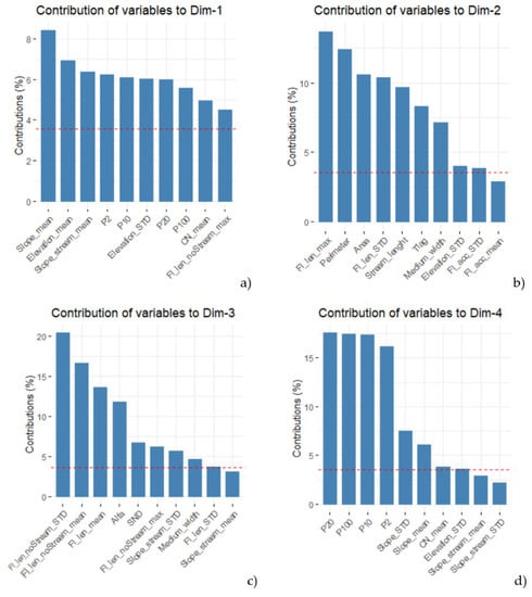 Contribution of variables for first four dimensions of PCA for all parameters. (a) to first, (b) second, (c) third, (d) fourth substitute variables.