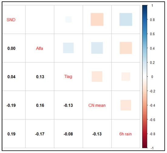 The six parameters were selected. Group C is represented by CN_mean. Slope_mean can also characterise group C. Moreover, CN_mean represents the retention capacity. Precipitation data have a separate group—group D. The parameter Tag from group A was chosen in the same way. This parameter interpreted the input to hydrological models more than the slightly better explanatory variables Fl_len_max or Fl_len_STD. A close correlation (R2 > 90) was found between all precipitation data. Rainfall with a return period of 20 years (P20) was chosen with regard to the possible hydrological response. With shorter repetition times, thus precipitation totals, the hydrological model may not lead to runoff, a repetition time of 100 years is too extreme, and the time series are relatively short to derive this repetition. Three parameters from group B were selected. Parameters SND and Alpha, around which subgroups are formed, together correlate with the parameter Fl_len_noStream_STD. All three of these parameters are explanatory variables of the third PCA component. Fl_len_noStream_STD explains (20%), SND (12%), and Alpha (7%) of this component. SND and Alpha do not correlate with each other, and together have the same explanatory weight as Fl_len_noStream_STD. SND and Alpha are direct value of the parameter and not of the Standard Deviation Parameter, and are more relevant to assign a risk level to these parameters.