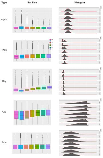 In order to classify the catchments into groups in terms of their potential response, it is necessary to compare the distribution of the classification parameters among the individual catchment categories. If the selected classification parameters were to show a different distribution for each group of catchments, it would imply that different size categories manifested a different type of hydrological response to a precipitation event. The objective is, therefore, to compare the differences between the respective size categories. The distribution of the five parameters selected for the individual size categories is presented in Figure 5. Visualization in the form of histograms has been chosen, showing the distribution of values and box plots, displaying the median value, the interquartile range, and outliers. The number of classes is the same for all histograms. The numbers of elements in the displayed histograms are normalized so that the distribution of the catchment representation in individual classes can be compared.