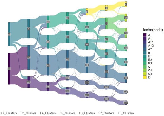 Sankey diagram of the development of clusters of SoLC. The widths of the bands are proportional to number of elements. The diagram also shows transfer of individual catchments and regrouping together with the growing number of clusters. The basic subdivision is already evident when two main groups (A, B) are formed. The groups generated up to five clusters, which are subdivisions of A or B. Group D, which is a combination of previously formed groups, is generated in the six clusters step. Group C arises when the number of clusters reaches seven and eight as combinations of Groups A2 and B2.