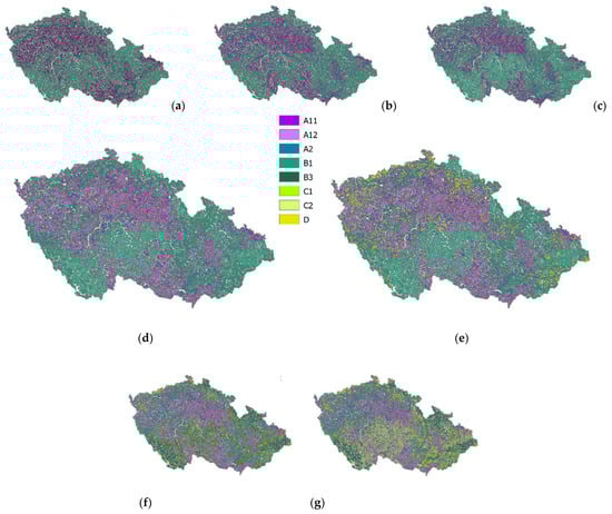- Seven Clusters—Group B2, which is characterized by relatively high precipitation volumes, has been noticeably divided. Together with some of the catchments of Group A2, it generates a new Group C, which is characterized by higher precipitation totals and, at the same time, higher CN values. Some of the catchments of initial Group B2 and some of the catchments of Group B1 generate Group B3, which retains parameters similar to those of initial Group B2. However, the number of catchments in initial Group B2 is so small that the group is renamed B3 (Figure 8f);