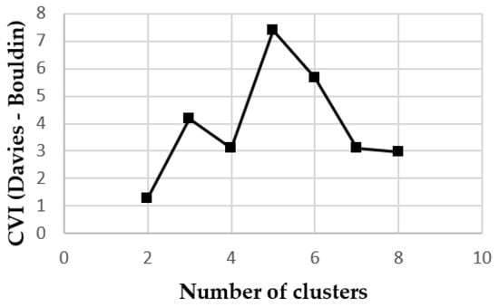 The Davies-Bouldin index was used to determine the optimal number of clusters using Clustering Validity Indices (CVI) (Figure 9). The optimal number of clusters from this is five. A suitable number of clusters is six, from which completely new class D arises (described in more detail in discussion).