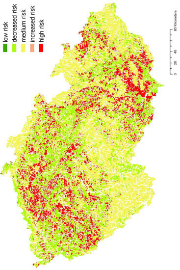 The main potential risk of flood in the FOC is the occurrence of rapid runoff. Flood risk management based on a catchment scale approach is widely adopted [21,22] with principle being that run-off can be managed most effectively with a combination of measures in the area of the catchment and downstream flood protections [23]. Potential risks associated with the rapid occurrence of runoff in terms of the FOC characteristics that are more sloping have less infiltration capacity with less permeable land use and higher precipitation. The risk can also be assessed in terms of the potential threat to the infrastructure by flood or sediment flux [24].