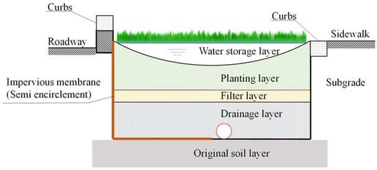 The bioretention facility in Sponge City will absorb most of the surface runoff, effectively reducing the probability of urban waterlogging. Road rainwater runoff enters the bioretention facility through the pavement and curb openings. The structural layer of the bioretention facility is usually composed of the water storage layer, planting layer, filter layer, and drainage system, etc. The typical cross-section is shown in Figure 1. The water storage layer is located on the surface of the facility and acts as temporary retention of rainwater runoff. The planting layer plays the role of infiltration and purification of rainwater runoff and preserves part of the rainwater to meet the need for plant growth. The filter layer can store part of the infiltration runoff and enhance the purification effect of the facility. The drainage system at the bottom is usually composed of a gravel layer and perforated drainage pipes wrapped in it, which serves to enhance the hydraulic conductivity and transport properties of the retention zone.