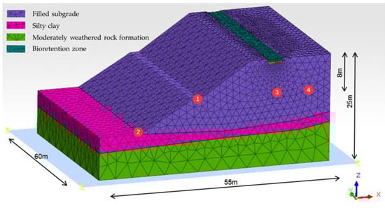The experiment selects a typical roadbed cross-section with a roadway width of 19 m and a roadbed height of 15 m. The transverse range, vertical range, and length range of the model calculation are 55 m, 25 m, and 60 m, respectively. The calculation model regards the rock and soil as an isotropic ideal elastoplastic material and uses the Mohr–Coulomb yield criterion for analysis. According to the size of the model, the bridle-way in the middle of the slope is selected as the control point 1, the slope foot as the control point 2, 8 m depth below the midpoint of the bioretention facilities as the control point 3, and 8 m depth below the midpoint of the carriageway as the control point 4 (Figure 2).