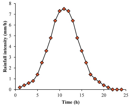 According to the engineering characteristics of road slopes, this study uses solid element tetrahedral meshes to divide the three-dimensional model, which can perform not only stress-strain analysis on subgrade slopes but also conduct stress-seepage coupling analysis considering the impact of rainwater seepage. The grid division simulation method has become a commonly used numerical analysis method in the engineering field, and the calculation results were verified by actual projects with high credibility []. The three-dimensional finite element meshing is shown in Figure 2. The boundary conditions are as follows: for the boundary conditions of the three-dimensional model, the displacement on the left and right sides of the model is constrained in the X direction, the displacement in the front and back directions is constrained in the Y direction, and the displacement in the lower part is constrained in the X, Y, and Z directions. Considering that the bio-retention facility and the slope surface are permeable layers, the rainfall boundary conditions are set at the surface of the bio-retention facility and the side slope surface of the roadbed. The rainfall intensity is selected according to heavy rainfall in the same area of the road project [], the rainfall duration is 24 h, and the rainfall intensity duration curve is shown in Figure 3.