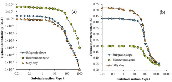 Hydraulic conductivity (a) and soil-water characteristic (b) curves of different materials.