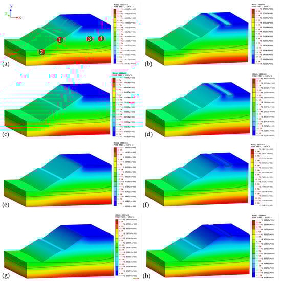 Comparison of water pressure distribution on subgrade slopes without or with biological retention facilities within 48 h after rainfall: (a,b) 6 h; (c,d) 12 h; (e,f) 24 h; (g,h) 48 h.