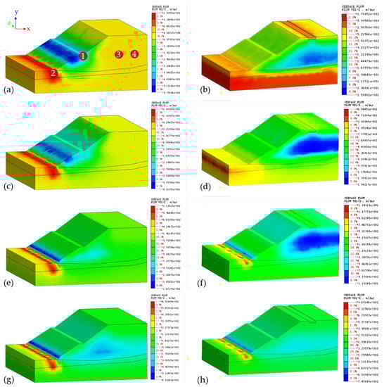 Comparison of water flow rate distribution in subgrade slopes without or with biological retention facilities within 48 h after rainfall: (a,b) 6 h; (c,d) 12 h; (e,f) 24 h; (g,h) 48 h.