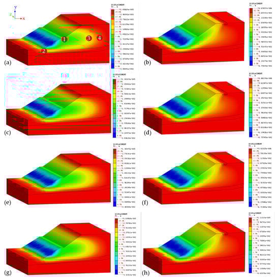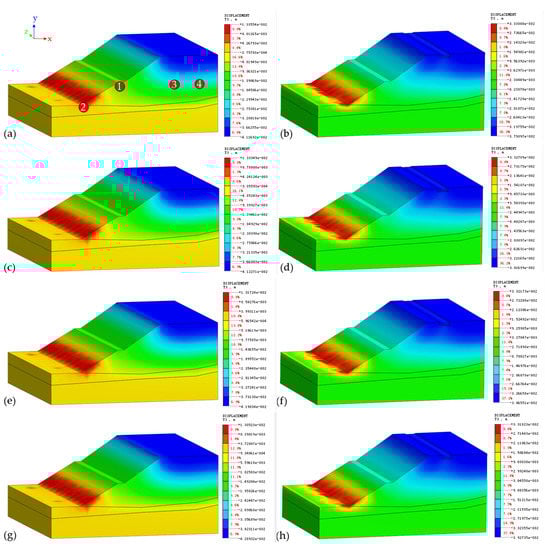Comparison of horizontal displacement distribution in subgrade slopes without or with biological retention facilities within 48 h after rainfall: (a,b) 6 h; (c,d) 12 h; (e,f) 24 h; (g,h) 48 h.