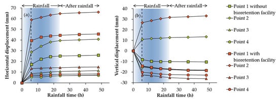 Figure 9 and Figure 10 show the horizontal and the vertical displacement distribution of the subgrade slope within 48 h after rainfall without and with bioretention facilities.